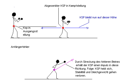 Habt Ihr Euren Stand gefunden, dann bleibt Euer KSP immer auf dieser Höhe, er bewegt sich sozusagen immer nur auf einer Ebene. Viele Anfänger machen den Fehler, dass sie bei einem Schlag ihr hinteres Bein nach oben strecken, um ihre Reichweite zu vergrößern. Dabei wird der KSP ruckartig diagonal nach oben bewegt, was dazu führt, dass der ganze Schwung auf dem vorderen Standbein landet.