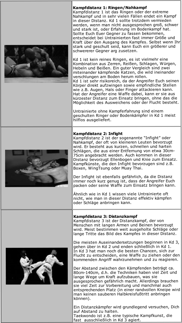 Folgend werden die drei Kampfdistanzen beschrieben, die in jeder physischen Auseinandersetzung, je nach Gegner oder Situation mehr oder weniger stark, auftreten werden.