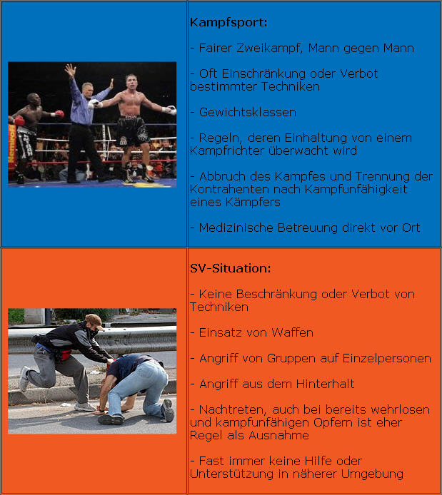 Dies kann, je nach Kampfkunst, Training oder Situation, für den Anwender lebensgefährlich sein. Ein Judoka ist es z.B. gewohnt, seinen Gegner zu greifen und anschließend mit einem Wurf zu Boden zu bringen. Was im Wettkampf gut funktionieren mag, kann in der SV tödlich sein, wenn der Angreifer über eine Waffe verfügt, die er im Gerangel zum Einsatz bringt (z.B. Messer, Rasierklinge u.s.w.).