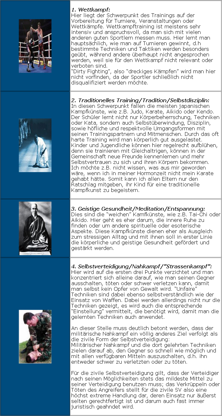 Nun ist es aber nicht selten der Fall, dass Vereine oder Schulen behaupten, mit der bei ihnen angebotenen Kampfkunst lassen sich alle Schwerpunkte gleich trainieren. Dies ist schlicht falsch!